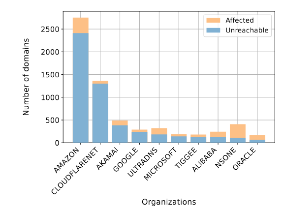 Amazon hosts over 2,500 domains for DNS (with most being reachable)